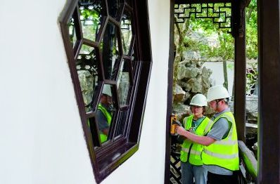 工作人员在苏州狮子林采集园林建筑信息数据,构建苏州古典园林要素数据库。新华社发