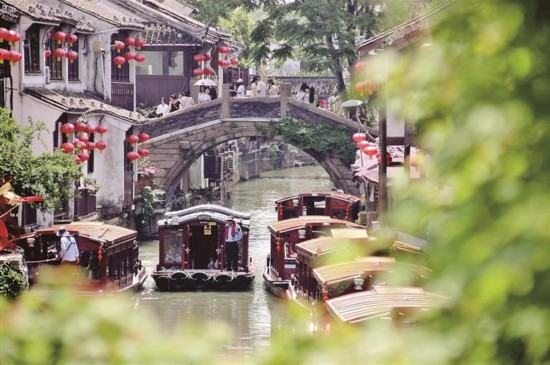 游客乘船游览苏州山塘街水巷。新华社发