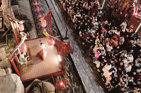 游客在西安大唐不夜城街区观看以唐代历史文化为背景创作的情景剧。新华社发