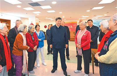 10日上午,习近平在西城区“吾老·新街”养老服务街区银龄老年公寓考察时,同老人们亲切交流。
