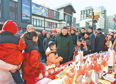 10日上午,习近平在东城区隆福寺街区新春市集考察时,同现场群众亲切交流。