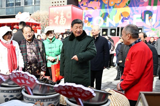习近平总书记同大家共赶新春市集,和店主摊主、市民游客频频互动、亲切交流,愉快地讲起年少时多次到隆福寺的情景,还购买了几份特色食品和文创产品。