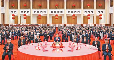 人民大会堂宴会厅灯光璀璨、喜气洋洋,各界人士2000多人欢聚一堂、共迎佳节,现场洋溢着欢乐祥和的节日气氛。