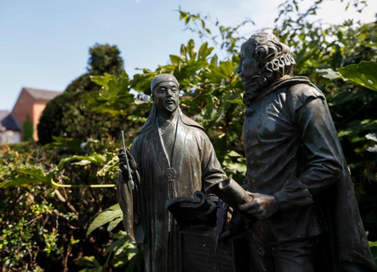 2022年4月20日在英国斯特拉特福拍摄的莎士比亚和汤显祖的青铜塑像。新华社记者 韩岩 摄